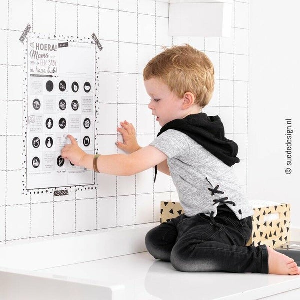 Elke week kan jouw kindje een sticker plakken met een afbeelding erop hoe groot de baby in je buik die week is. Ook staan er leuke weetjes en opdrachtjes verdeeld over de poster. Er zitten ook extra stickertjes bij met o.a. de tekst "wachten duurt lang...", "Hoera de baby is geboren" en "Hoera een broertje/zusje!"