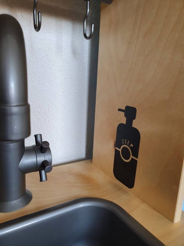 Deze sticker kan bijvoorbeeld aan de zijkant naast de kraan geplakt worden.