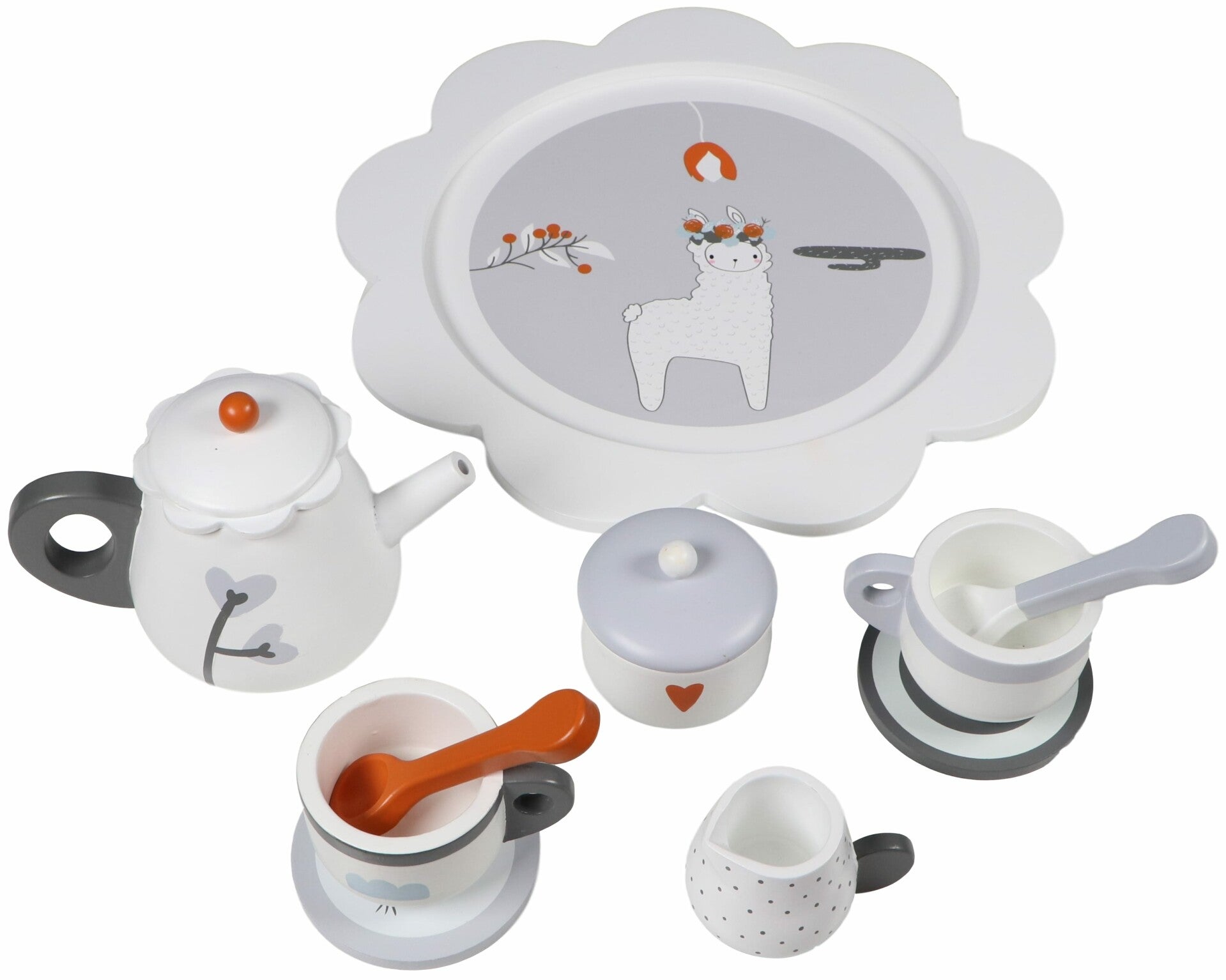 De set bevat een dienblad met een lama design, theepot, suikerpotje, melkkannetje, 2 kopjes, 2 onderzetters en 2 lepeltjes.