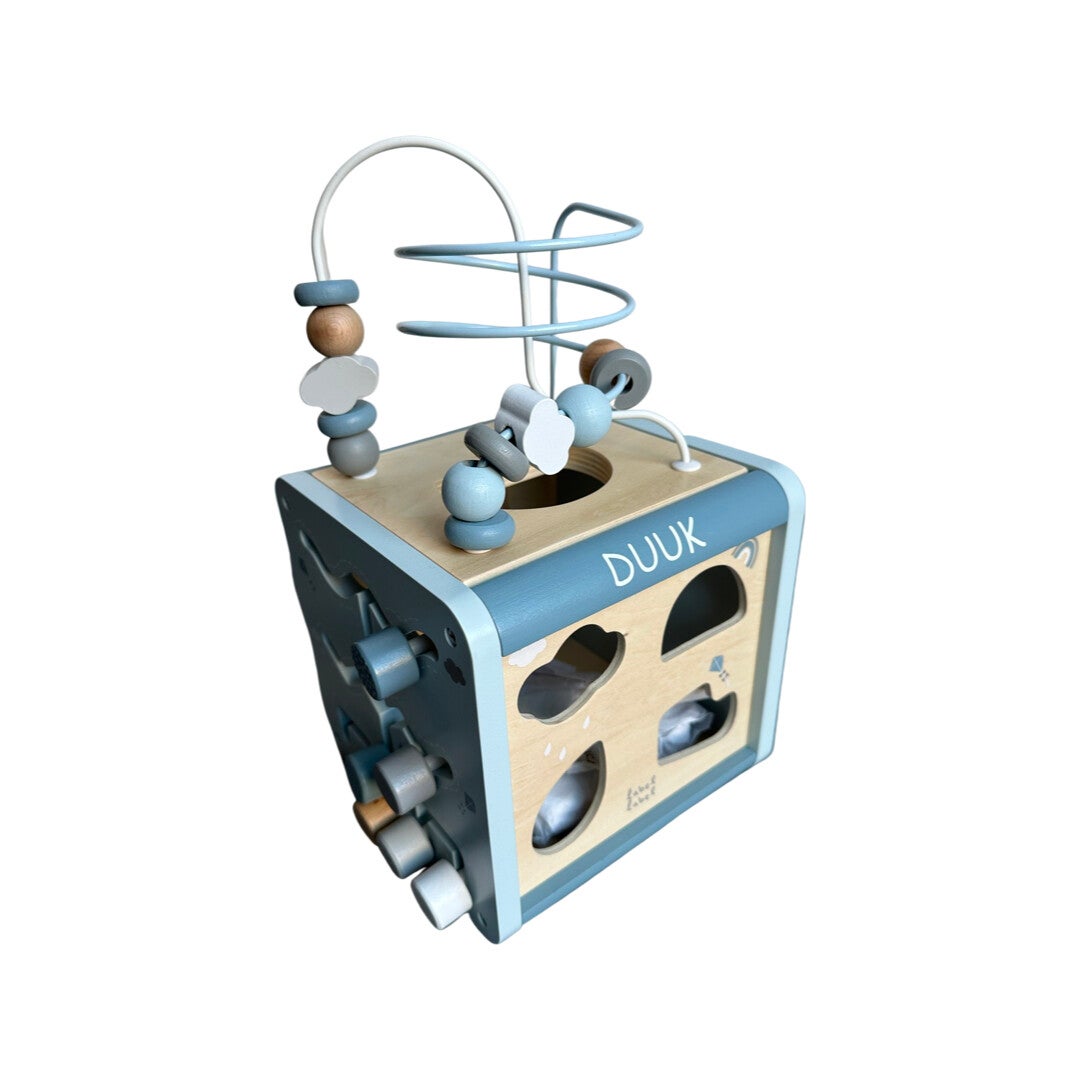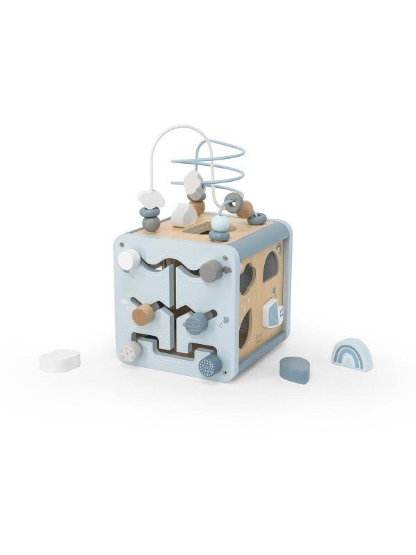 Wat een uitdagingen heeft deze Label Label activiteitenkubus voor je kindje. Gegarandeerd uren speelplezier met de leerzame activiteiten zoals een vormenstoof, draaiend wiel, xylofoon en boven op een leuke kralenspiraal. Bij elke activiteit ontwikkelen kinderen hun fijne motoriek en worden ze aangemoedigd om hun creativiteit te gebruiken. Dit speelgoed wekt nieuwsgierigheid bij kinderen op en zorgt voor veel speelplezier.