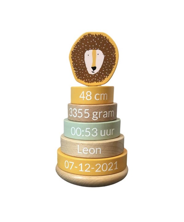 De tuimelstapelaar is te voorzien van naam en geboortegegevens. Mocht je niet alle gegevens voorhanden hebben dan kan dit ook worden vervangen door bijvoorbeeld de tijd van geboorte of de geboorteplaats. Je bent zelf vrij om invulling te geven.
