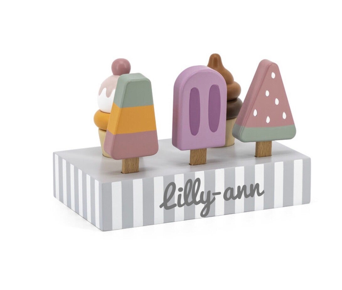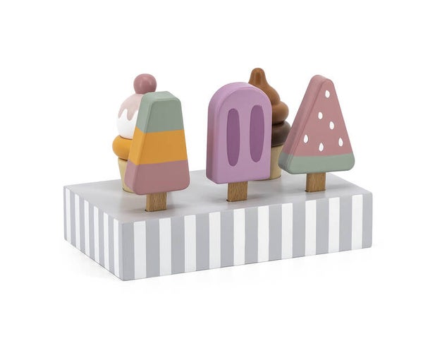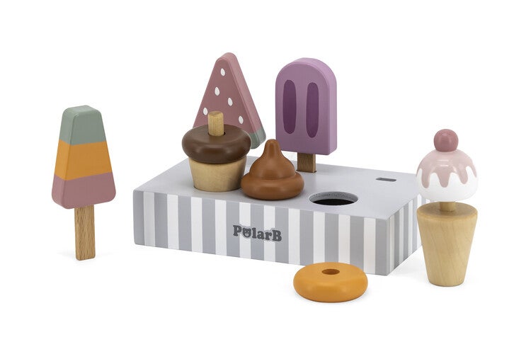 De schattige ijsjeset van PolarB bestaat uit 5 verschillende ijsjes, Je kunt 2 van de ijsjes uit elkaar halen en van smaak wisselen, gepresenteerd in een houten houder. Helemaal klaar om uitgedeeld te worden!