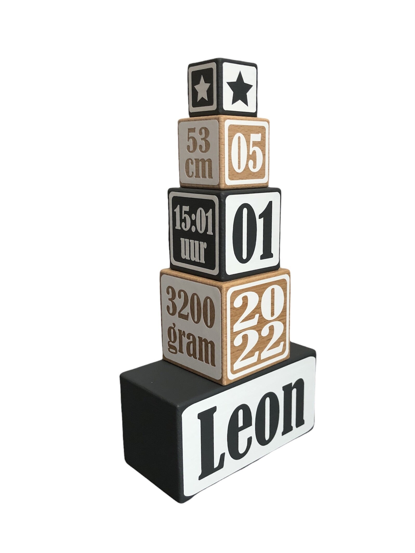 Deze geboortetoren is van mooie stevige kwaliteit en gemaakt van beukenhout. Er zijn 3 blokken met verf antraciet grijs geschilderd (op de foto lijkt het donkerder dan het is) en 2 blokken zijn nog gewoon hout. Ze kunnen voorzien worden van de naam, geboortedatum, lengte, gewicht en geboortetijd en het bovenste blokje wordt voorzien van een sterretje of een hartje. De bestickering zit aan de voorkant en aan één zijkant van de blokken.