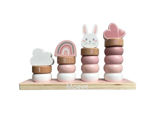 Deze super leuke Label Label houten stapelringen in mooie roze pastelkleurtjes met verschillende diertjes en vormen zorgt voor uren speelplezier.