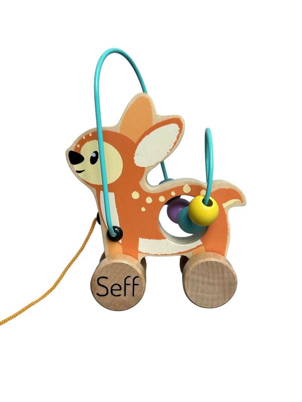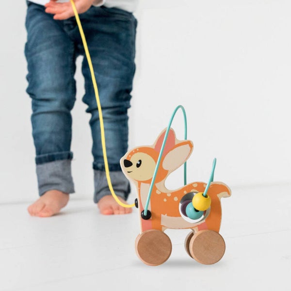 Het is fijn om samen met het hert trekfiguur van Studio Circus de wijde wereld te ontdekken. En zodra de beentjes moe zijn, kunnen de handjes zich vermaken met het kralendoolhof. Volg het gekleurde draad en schuif de kralen van de ene naar de andere kant. Na deze training van de fijne motoriek en oog-handcoördinatie kan de ontdekkingsreis weer vervolgd worden.
